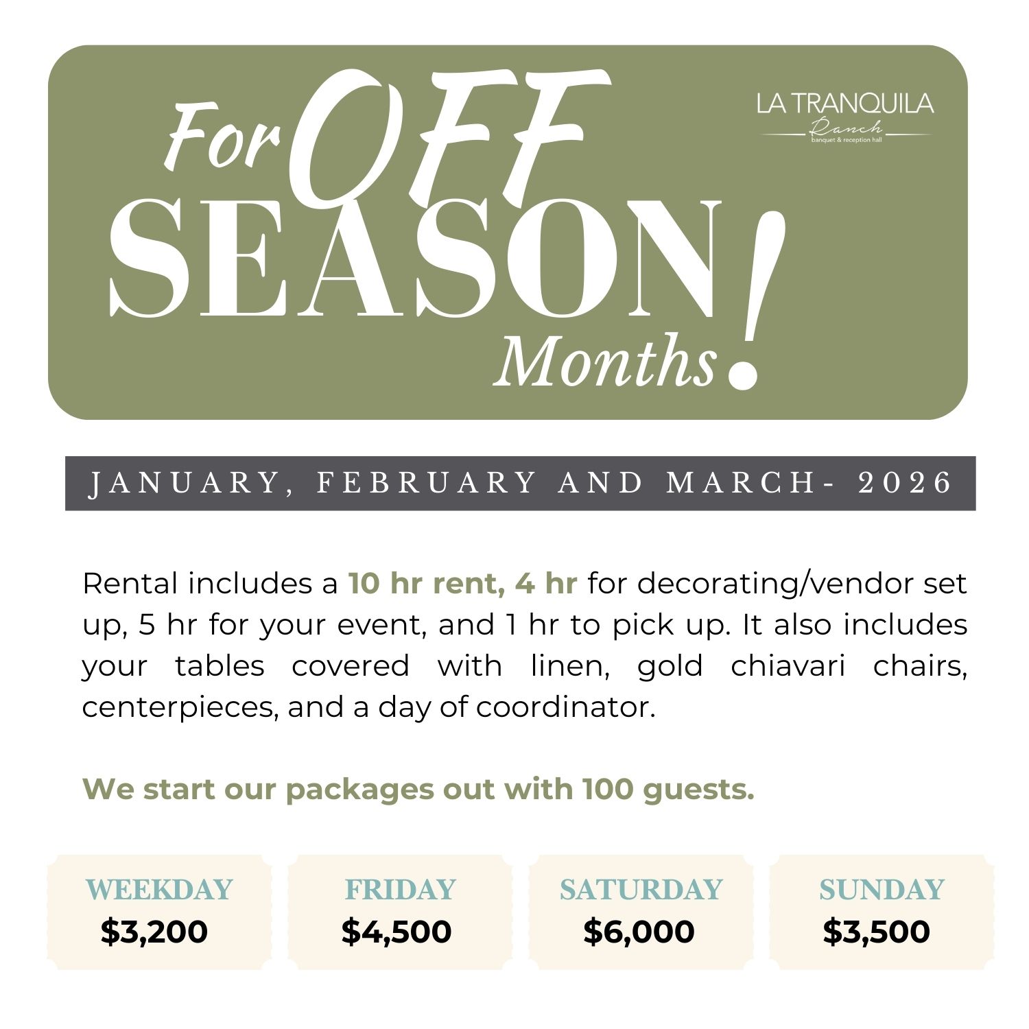 The entire staff of La Tranquila Ranch was amazing! My wedding day was just perfect. Kerem helped do all my final touches and answered all questions I had. I will be back to them in the future for sure for another celebration. Debrah made sure everything was perfect the day of my wedding and I cannot say more to the staff- thank you, thank you, thank you!!