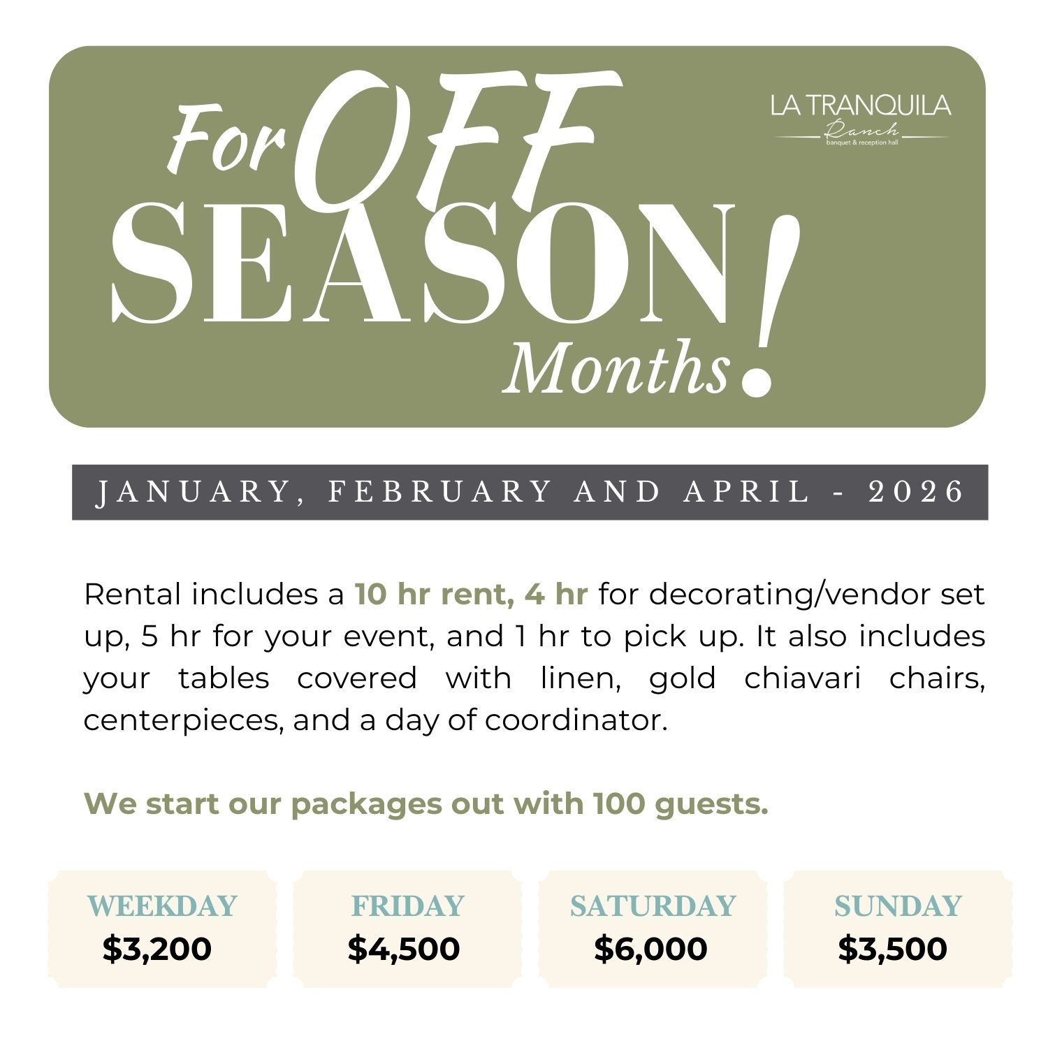The entire staff of La Tranquila Ranch was amazing! My wedding day was just perfect. Kerem helped do all my final touches and answered all questions I had. I will be back to them in the future for sure for another celebration. Debrah made sure everything was perfect the day of my wedding and I cannot say more to the staff- thank you, thank you, thank you!!